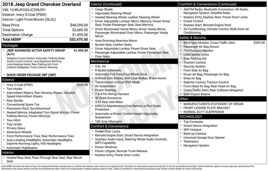 Discover the refined power and exceptional capabilities of the 2018 Jeep Grand Cherokee Overland. Visit our showroom today and experience this remarkable vehicle for yourself. We're confident that once you take it for a test drive, you'll be captivated by its uncompromising performance, luxurious amenities, and unwavering safety.