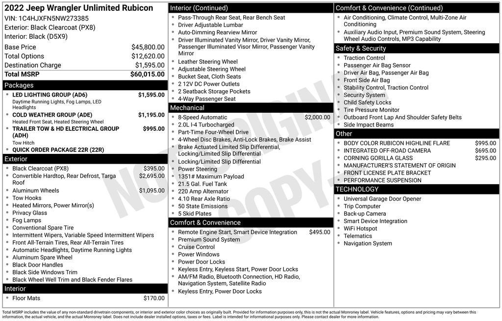 This 2022 Jeep Wrangler Unlimited Rubicon is a true off-road icon, ready to take you on thrilling adventures. Boasting a powerful 2.0L I4 DOHC engine paired with an 8-Speed Automatic transmission and 4WD, this Wrangler delivers impressive performance both on and off the beaten path. Outfitted with a stunning Black exterior, this Wrangler Unlimited Rubicon is equipped with a host of premium features that will elevate your driving experience.