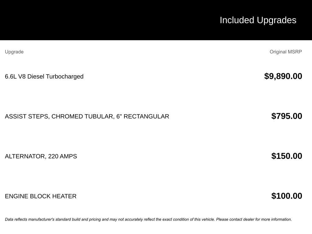 • 6.6L V8 Diesel Turbocharged (Duramax) (B20-Diesel Compatible) (445 hp [332 kW] @ 2800 rpm, 910 lb-ft of torque [1220 Nm] @ 1600 rpm)