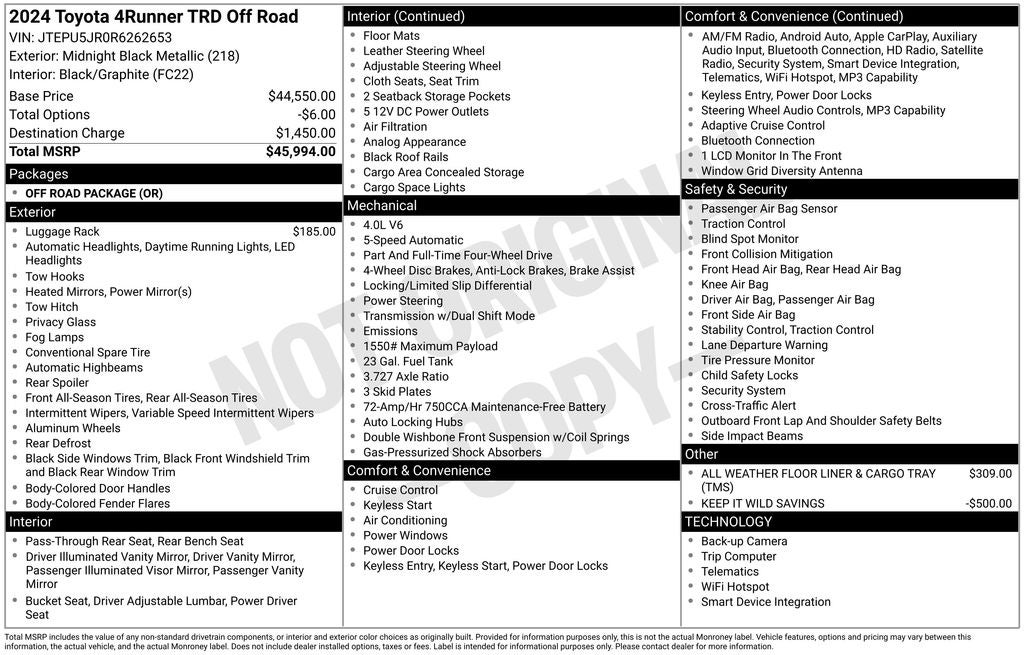 2024 Toyota 4Runner TRD Off-Road Midnight Black Metallic 4WD 4.0L V6 DOHC 24V 5-Speed with ECT