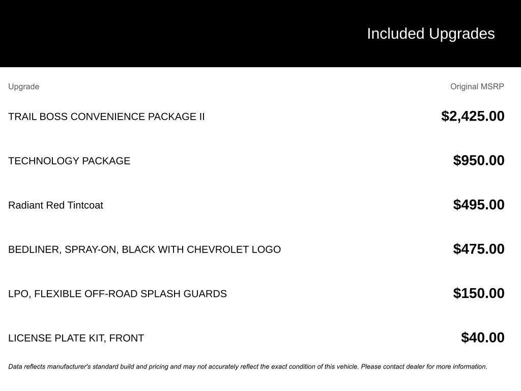 - Trail Boss Preferred Equipment Group includes standard equipment